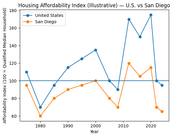 Even as national affordability improved modestly at times, San Diego remained structurally less affordable due to higher prices and limited supply.